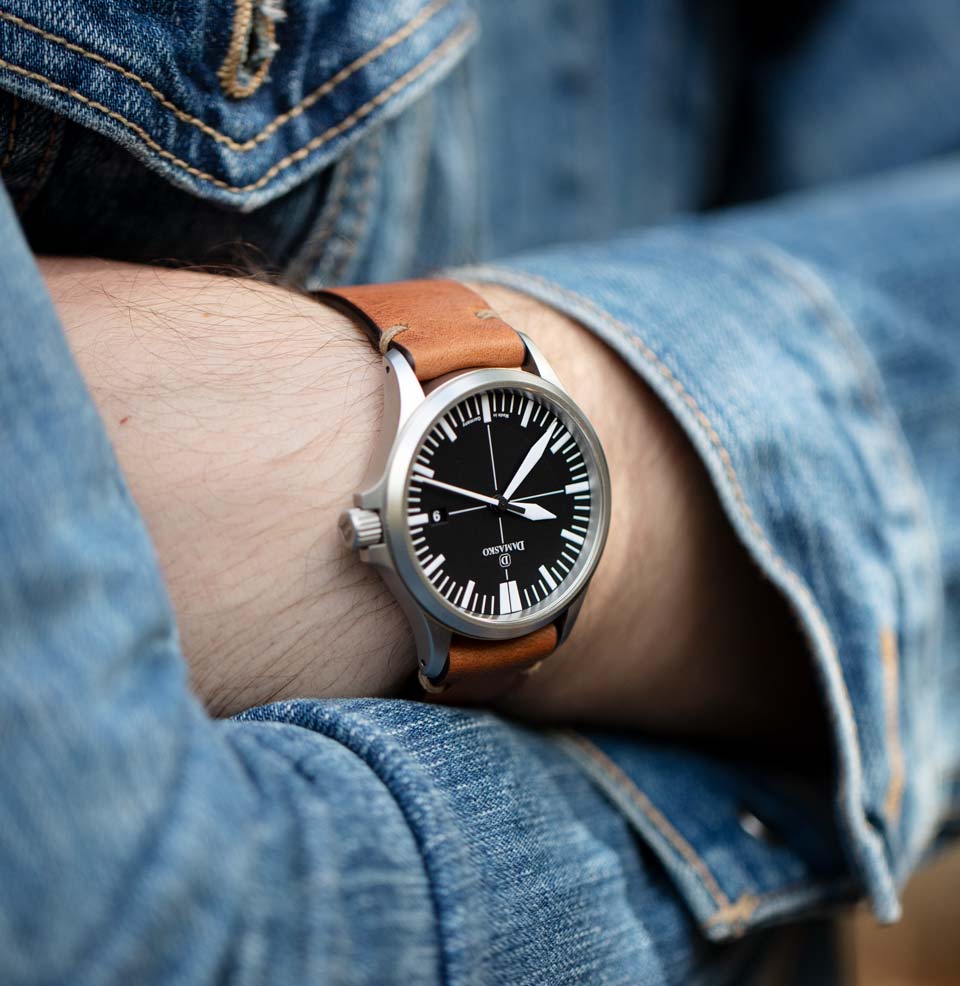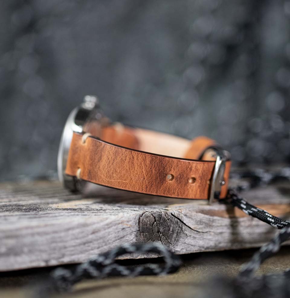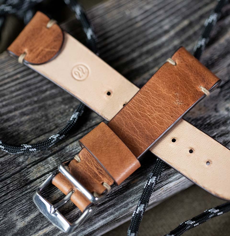 The Model 2 Premium is a more refined version of our Model 2 Classic strap. For the Premium, we took the same tapering 2-piece strap design, but made it out of a combination of Wickett & Craig vegetable tanned lining and Horween top leather. The edges are now painted with several layers of complimentary color, for a cleaner fit and finish.The knots are hand-tied out of thick braided, waxed cotton cord for a hand-made detail. We used both a fixed metal loop as well as a wide leather band for keepers, creating a rugged detail that hints at military straps. By mixing elements of dress and sport straps, the Model 2 Premium has a retro aesthetic that is simultaneously masculine and elegant. Try this on everything from your beat up tool diver to your dress-casual vintage piece. The Model 2 Premium was designed by Worn & Wound and manufactured in New York City.