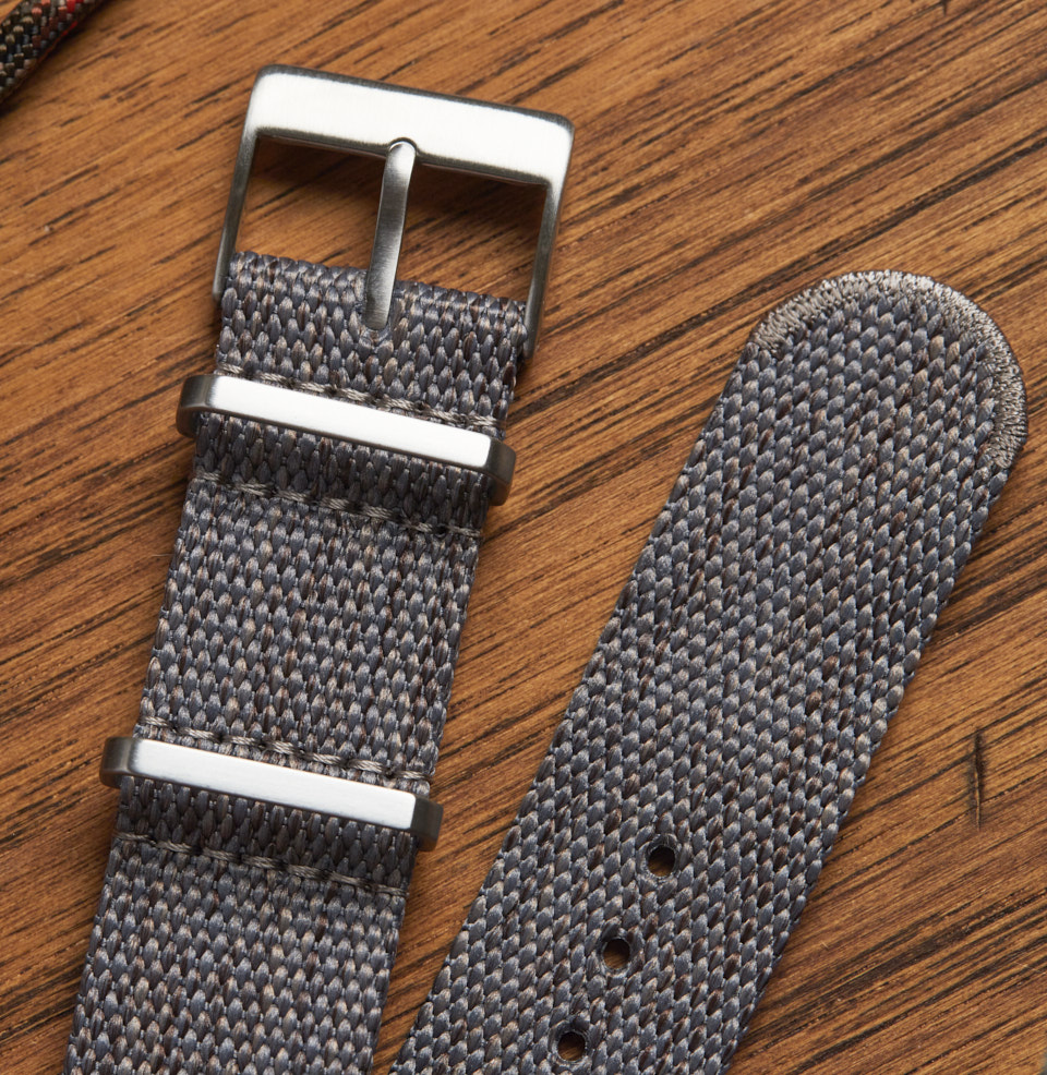 A proprietary fabric, it is woven from non-reflective nylon fibers in a heavy pattern, giving it a canvas-like look. Soft, supple, they are unlike any other nylon strap you’ve tried, having a truly luxurious look and feel. They are also beautifully made and detailed with fully stitched tails to prevent fraying, perfect ultrasonic cut holes, and machined 316L steel hardware.