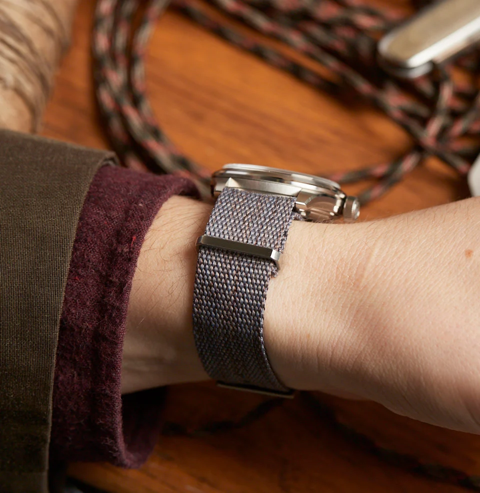 Available in gorgeous solids like Olive Jade, Greige, and Space Blue, but also unique melanges like Tundra and Shadow, which randomly mix different color threads to create an overall palette, there is a color to suit any watch. Available in 19mm, 20mm, and 22mm.