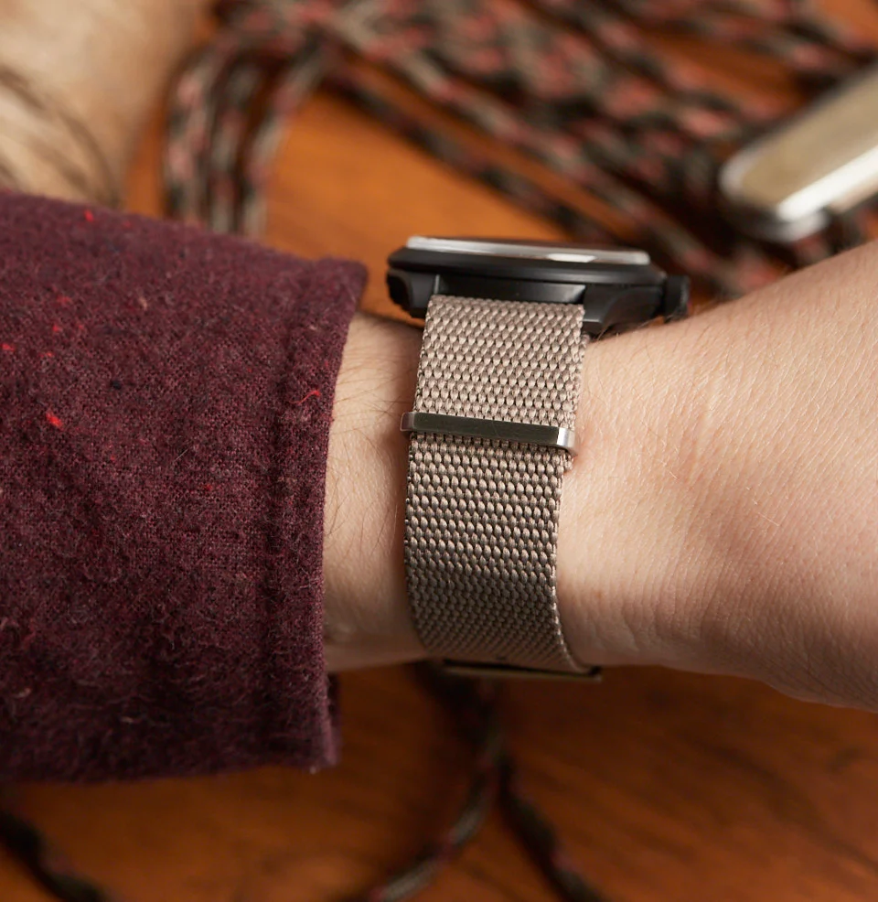 Available in gorgeous solids like Olive Jade, Greige, and Space Blue, but also unique melanges like Tundra and Shadow, which randomly mix different color threads to create an overall palette, there is a color to suit any watch. Available in 19mm, 20mm, and 22mm.