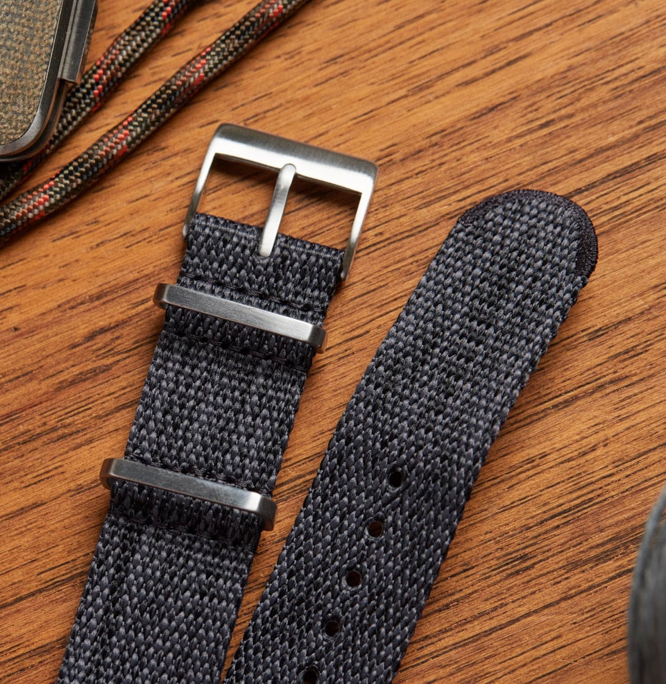 A proprietary fabric, it is woven from non-reflective nylon fibers in a heavy pattern, giving it a canvas-like look. Soft, supple, they are unlike any other nylon strap you’ve tried, having a truly luxurious look and feel. They are also beautifully made and detailed with fully stitched tails to prevent fraying, perfect ultrasonic cut holes, and machined 316L steel hardware.